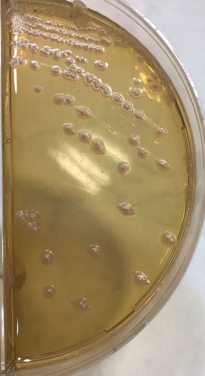 Gram (+) and Gram (-) bacterias do not grow on Saburo agar, because we add Gentamicin to this agar. This Pseudomonas aeruginosa has been grown on Saburo agar, because it is resistant to gentamicin.