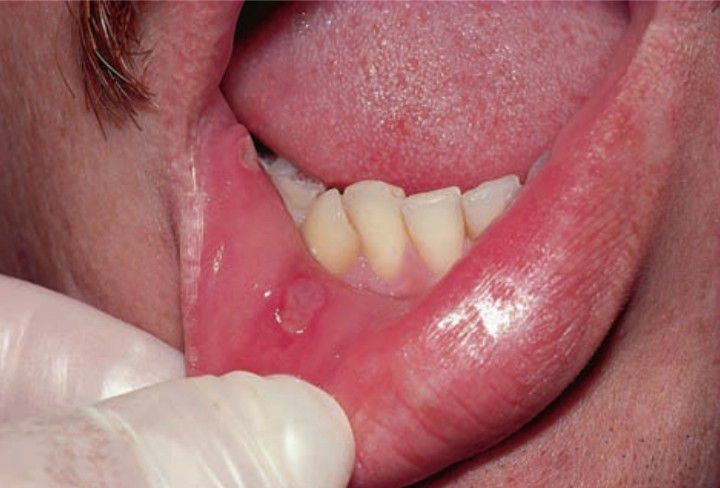 This type usually appears as a single, painful, oval ulcer that is less than 0.5 cm in diameter, covered by a yellow fibrinous membrane and surrounded by an erythematous halo.