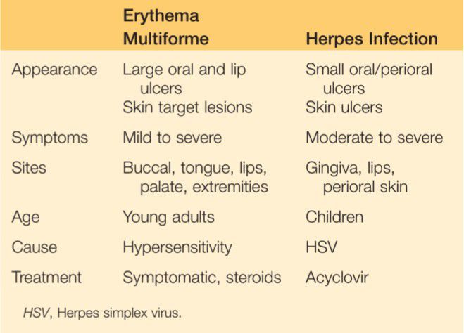 This chart provides all necessary differences between erythma multiforme and herpes infection.