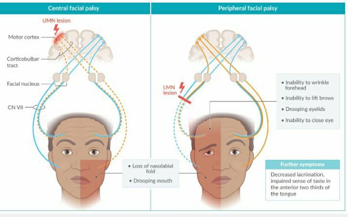 Examination findings in facial nerve palsy. Symptoms in central facial palsy are caused by a contralateral upper motor neuron (UMN) lesion. Because muscles responsible for eyelid and forehead movements are innervated by upper motor neuron fibers from both hemispheres, their function is preserved in central facial palsy. In peripheral facial palsy, damage to lower motor neuron (LMN) fibers results in ipsilateral paralysis of all facial muscles. Because sensory and autonomic fibers join the lower motor neuron fibers of the facial nerve in its peripheral course, peripheral facial palsies can also manifest with non-motoric symptoms.