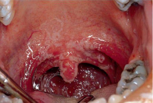 Characteristically white, soft plaques that sometimes grow centrifugally and merge. Plaques are composed of fungal organisms, keratotic debris, inflammatory cells, desquamated epithelial cells, bacteria.