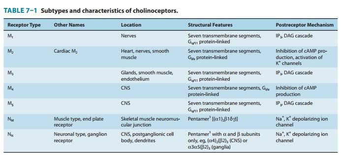 Subtypes and characteristics of cholinoceptors