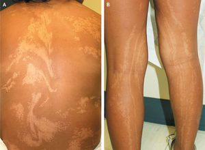 A Hispanic girl who had been born at term to healthy nonconsanguineous parents was affected by brachycephaly, developmental delay, a mild cognitive deficit, and behavioral disturbances. Cytogenetic testing revealed an apparently balanced translocation between an X chromosome and a chromosome 2 (breakpoints, Xp11.2 and 2q35). When the girl was seen for dermatologic consultation at 8 years of age, we observed hypopigmentation streaks in a wavy pattern on the trunk (Panel A) and a linear pattern on the limbs (Panel B). Lines of Blaschko, believed to be the expression of clones of abnormal cells migrating toward the periphery during embryonic life, are visualized in a wide variety of genodermatoses. An enormous range of cytogenetic abnormalities can cause pigmentary mosaicism. In particular, Blaschkolinear hypopigmentation (also called hypomelanosis of Ito) is typically linked to translocations between an X chromosome (loci Xp11.21 and Xp11.22) and an autosome.