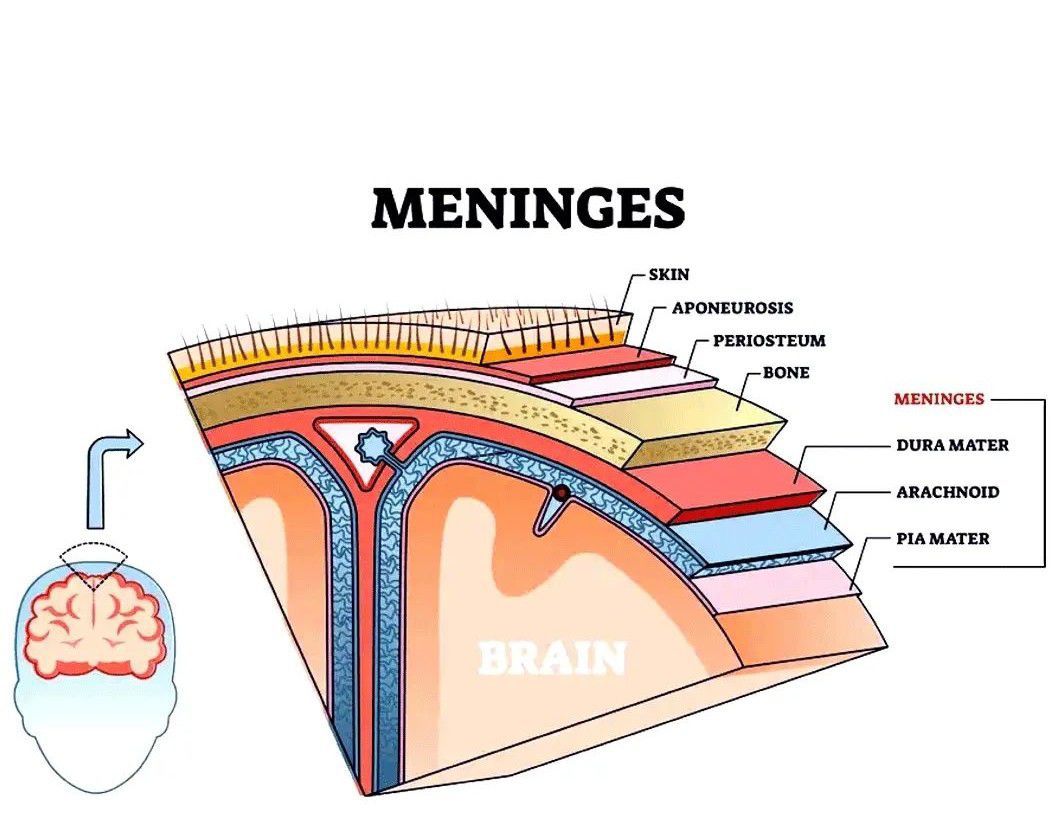 Three layers of membranes known as meninges protect the brain and spinal cord. The delicate inner layer is the pia mater. The middle layer is the arachnoid, a web-like structure filled with fluid that cushions the brain. The tough outer layer is called the dura mater.