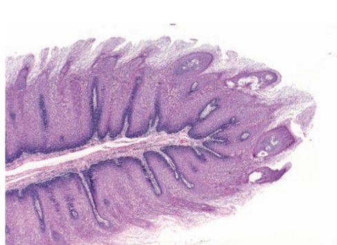 Oral squamous papillomas represent an exaggerated growth of benign squamous epithelium . The lesions are exophytic composed of finger-like extensions of epithelium, supported by a well-vascularized connective tissue core.