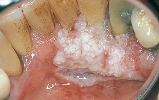 In time, the lesion borders become irregular and indurated. As verrucous carcinoma develops, the lesion becomes exophytic with a whitish to gray shaggy surface. Although not highly infiltrative, the lesion pushes into surrounding tissues. When it involves the gingival tissues, it becomes fixed to the underlying periosteum