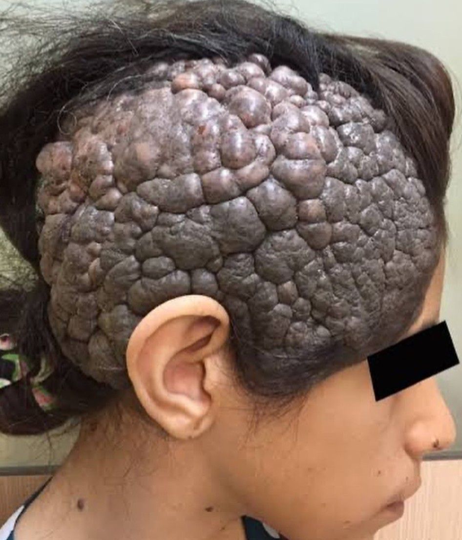 A 12-year-old immigrant female was admitted in the dermatology department with multiple brown lesions on the trunk and face and a large cerebriform plaque on the right side of her scalp. She was born with multiple brown papules and nodules on the trunk and face and a brown patch on the right side of her scalp. She reported an increase in the size of the lesions on her body and face over time and there was no associated pain or itching. According to history given by her parents, the lesion on the scalp was a small brown flat patch at birth and had increased in size and thickness over the last 8 years and in the past 5 years it had become nodular and cerebriform. The patient complained of intense itching and discharge which had recently become malodorous. Her birth and developmental history were normal. In physical examination, her developmental and nutritional status was normal. The head circumference was in normal range and her neurologic, cardiovascular, musculoskeletal, and ophthalmic examinations were normal The mass on the scalp sized 22 cm × 18 cm × 2.5 cm approximately with a nodular surface spread across the right side of the scalp.