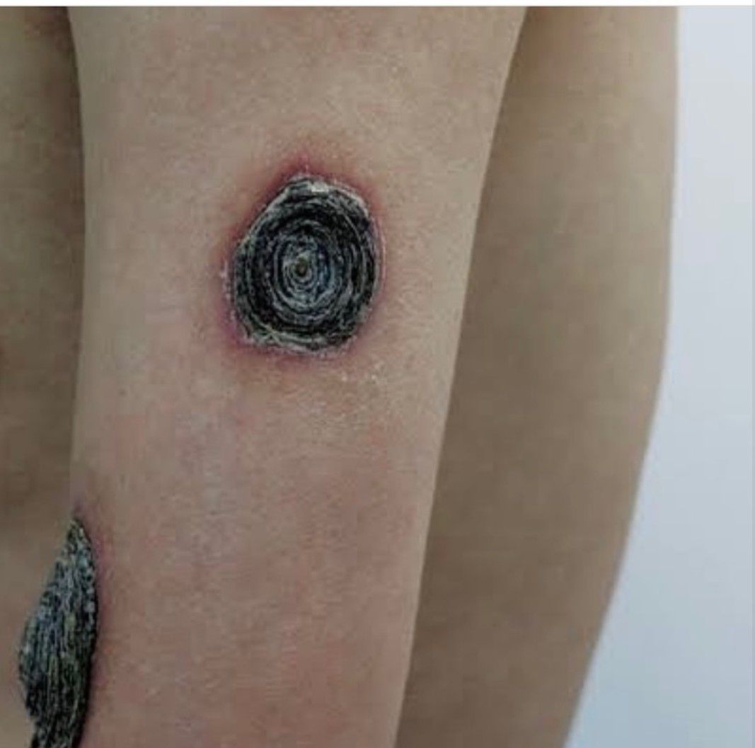 A 44-year-old man with HIV infection presented with a 1-month history of fevers and skin lesions. Examination was notable for blackish-brown lamellated plaques on his limbs and scalp that resembled oyster shells.