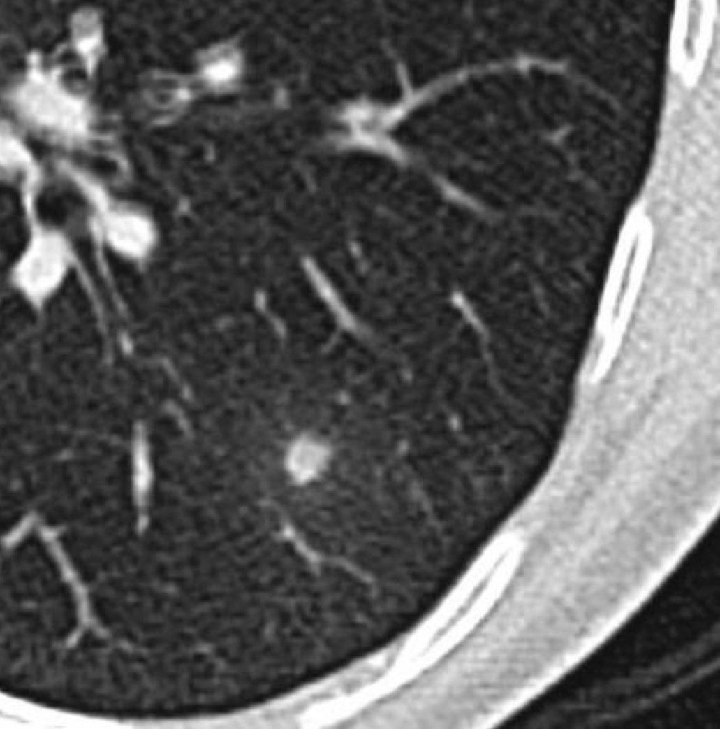 There is a 6 mm nodule in the left lower lobe, with faint surrounding ground glass attenuation, which is new compared with a CT chest from 5 months prior. The ground glass halo around a nodule suggests involvement of the adjacent alveoli or septa at a resolution too fine for our CT equipment... it could represent either fluid/hemorrhage or possible "lepidic" growth of a tumor (as with bronchoalveolar cell carcinoma).. By: https://www.instagram.com/p/C4-zEILN-4J/?utm_source=ig_web_copy_link