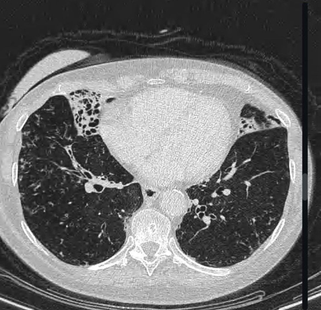 Extensive bronchiectasis and volume loss predominantly affecting the right middle lobe and the lingula segment of the left upper lobe. Bronchiectasis is also present at the lung bases. Centrilobular nodules and tree-in-bud nodularity are seen with basal predominance. Sputum was positive for Mycobacterium avium 5 years ago and the patient underwent antituberculosis treatment. This pattern of lung involvement (right middle lobe and lingula predominant) with bronchiectasis and volume loss is typical for Mycobacterium avium complex (MAC) infection.