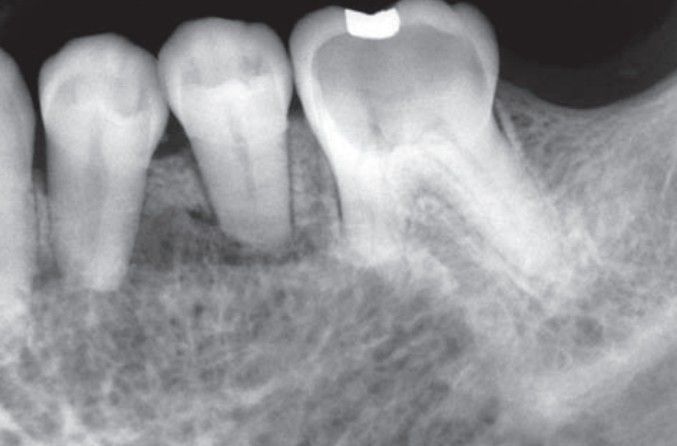 Hemangioma of bone showing honeycomb radiographic pattern with associated root resorption.