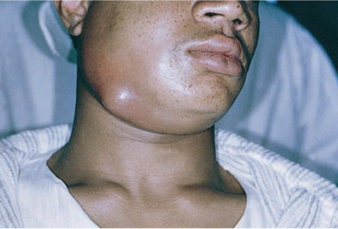 Cutaneous abscess related to extension from a mandibular periapical abscess.