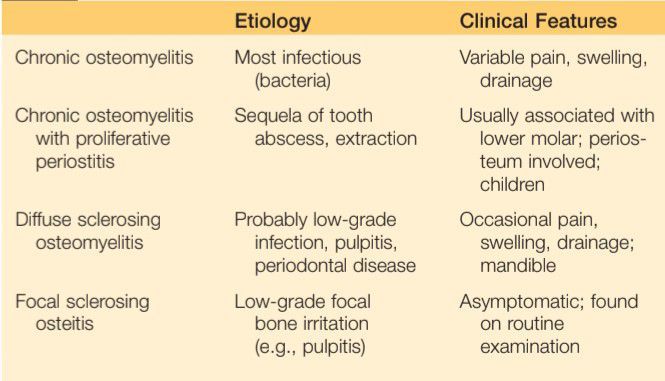 Various types of chronic osteomyelitis with etiologies and clinical features.