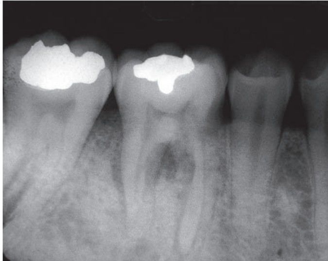 Osteosarcoma surrounding the roots of the first molar tooth. Note widened periodontal ligament.
