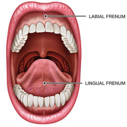 Labial frenal attachments are thin folds of mucous membrane with enclosed muscle fibers originating from orbicularis oris muscle of upper lip that attach at the lips to the alveolar mucosa and underlying periosteum. [2] It extends over the alveolar process in infants and forms a raphe that reaches the palatal papilla.