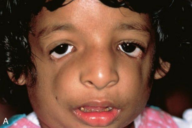 Treacher Collins syndrome.Note sloping palpebral fissures and colobomas of the lower eyelids.