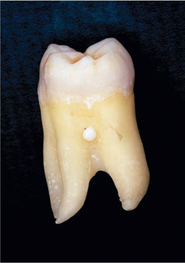 Droplets of ectopic enamel, or so-called enamel pearls, may occasionally be found on the roots of teeth. They occur most commonly in the bifurcation or trifurcation of teeth