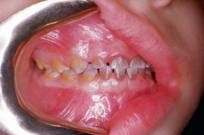 Tetracycline stain. Note the yellow color (tetracycline) of the posterior teeth and the gray color of the anterior teeth, in which oxidation of endogenous tetracycline has occurred