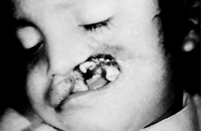 Related to ANUG is noma (cancrum oris), which predominantly affects children in sub-Saharan Africa. This disease is characterized by necrosis that progresses from the mouth through the cheek to the facial skin, causing extensive disfigurement.