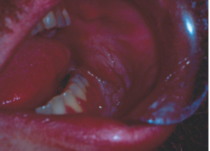 White leathery nodular tobacco pouch. These thickened areas are more worrisome for malignant transformation.