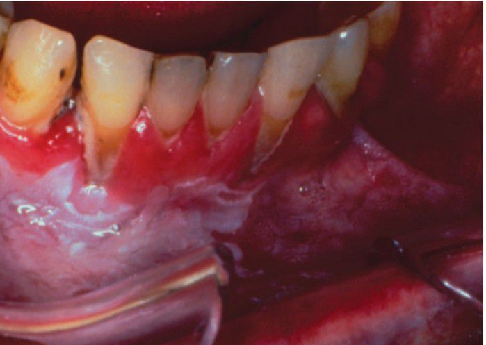 Snuff pouch showing extensive periodontal tissue destruction and a thickened area of leukoplakia.