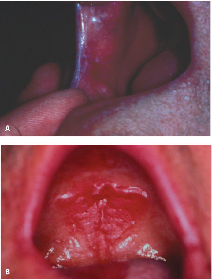 A, Candidal leukoplakia, a chronic form of candidiasis in which firm red white plaques form, most often in the cheeks. B, Occasionally, the plaques develop in the palate opposite a tongue lesion (kissing lesions).