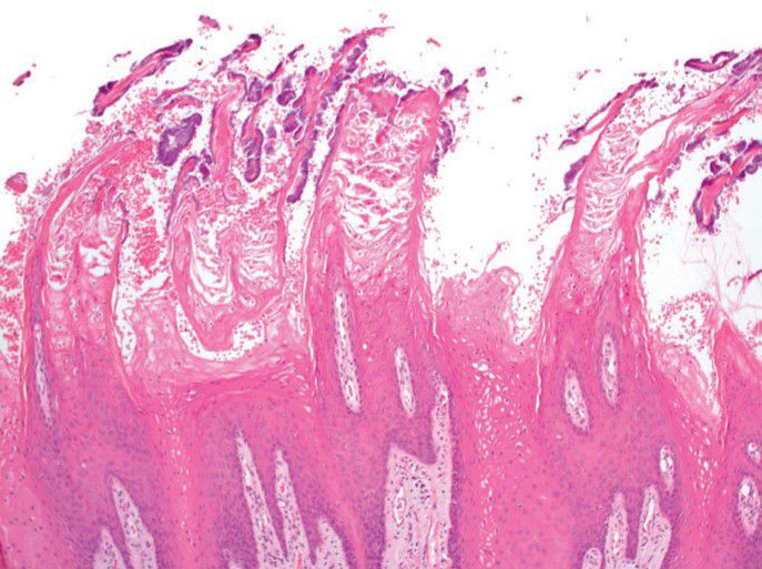 Elongation and marked hyperkeratosis of the filiform papillae with bacterial accumulation on the surface.