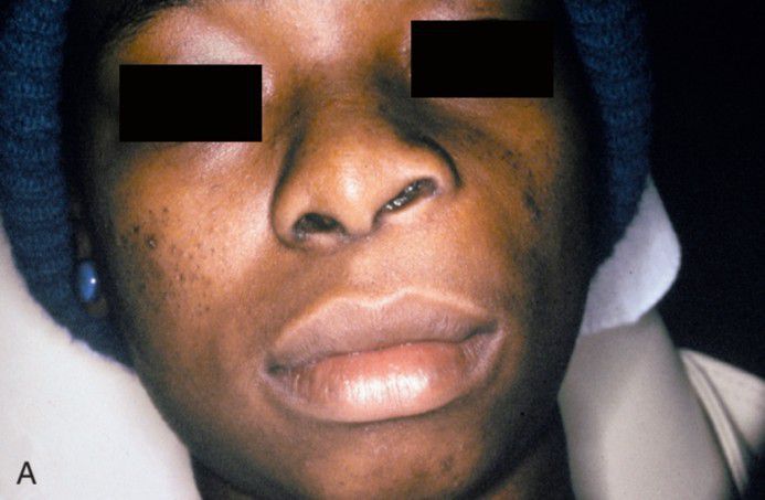 Enlargement of the left upper lip with elevation of the ala of the nose.