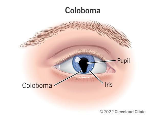 A coloboma is a hole in one of the structures of the eye, such as the iris, retina, choroid, or optic disc