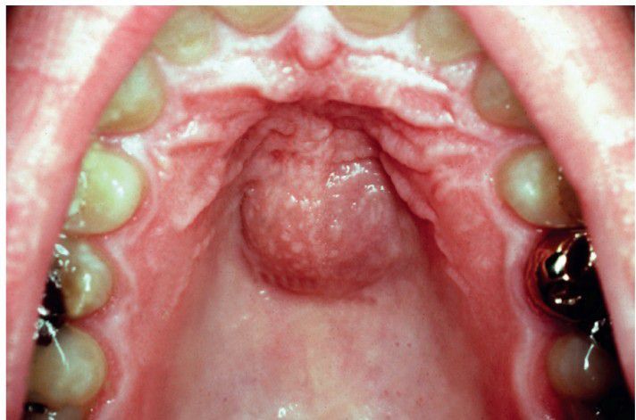 Median Palatal Cyst. Compressible mass in the midline of the hard palate posterior to the incisive papilla. (Courtesy of Dr. Craig Fowler.)