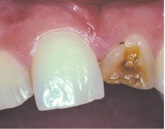 Extensive coronal hypoplasia of permanent maxillary left central incisor secondary to previous trauma to deciduous central incisor.