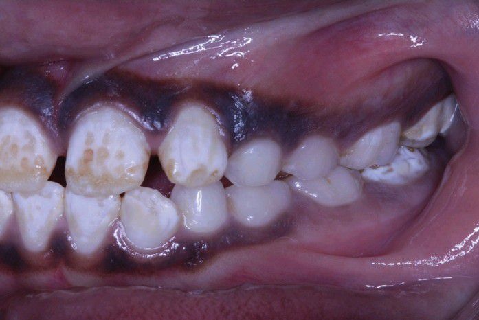 Dentition exhibiting lusterless, white, and opaque enamel with areas of chipping. Notice that the deciduous teeth are spared.