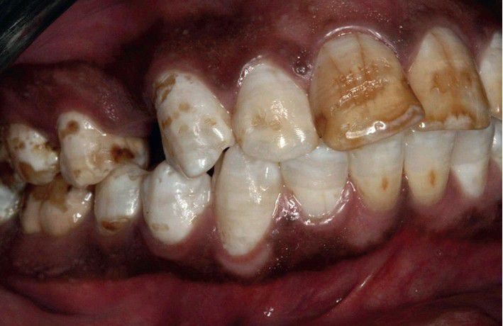 Diffuse white opaque alteration of the dentition with areas of brown enamel mottling. Patient spent his childhood in Keny