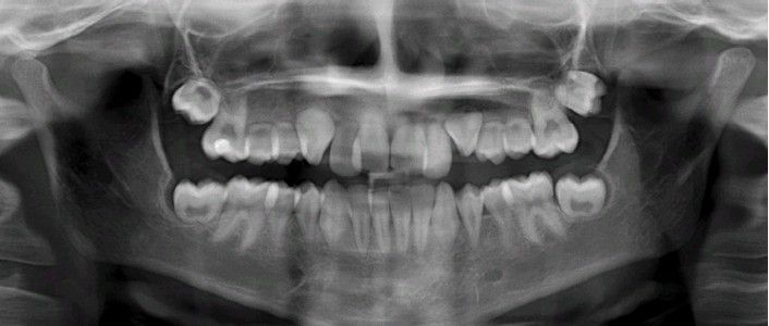 Multiple teeth demonstrating radicular hypoplasia secondary to radiation and chemotherapy for cancer.