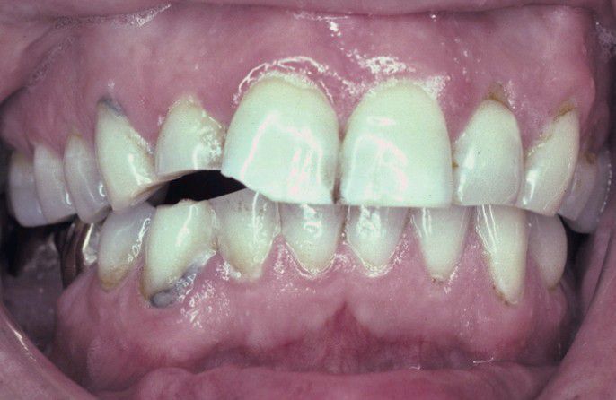 Notching of the anterior dentition on the right side caused by long-term use of tobacco pipe.