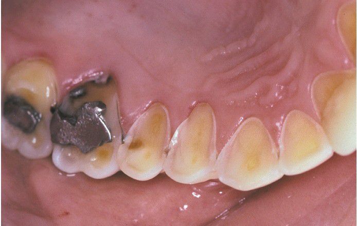 Palatal surfaces of the maxillary dentition in which the exposed dentin exhibits a concave surface and a peripheral white line of enamel. The patient had bulimia.
