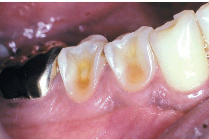 Extensive loss of enamel and dentin on the buccal surface of the maxillary bicuspids. The patient had sucked chronically on tamarinds (an acidic fruit)