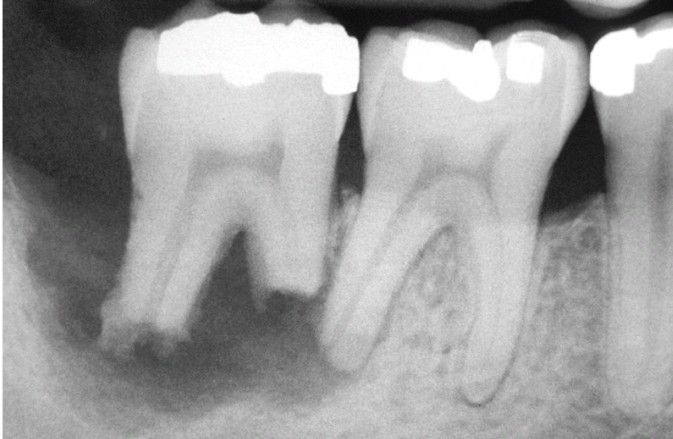 Extensive irregular destruction of both roots of the mandibular second molar associated with chronic periodontitis. (Courtesy of Dr. Tommy Shimer.)