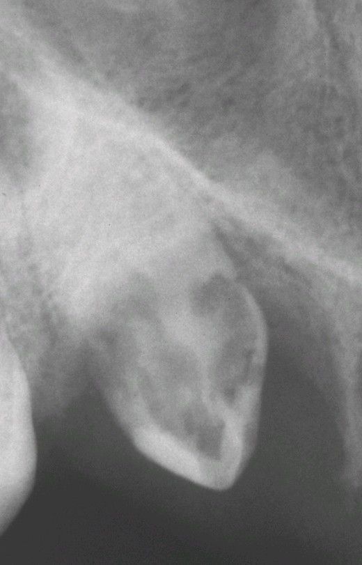 Extensive external resorption of the crown of the impacted right maxillary cuspid. Histopathologic examination revealed resorption without bacterial contamination or caries.