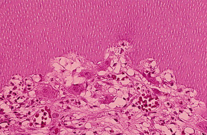 Resorption of the inner dentinal wall of the pulp. Note cellular and vascular fibrous connective tissue, which exhibits an adjacent inflammatory infiltrate and numerous dentinoclasts within resorptive lacunae