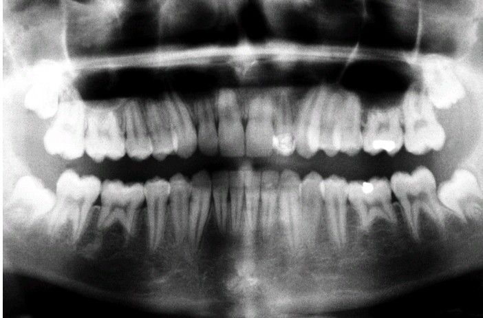 First molars in all four quadrants demonstrate extensive radicular external resorption