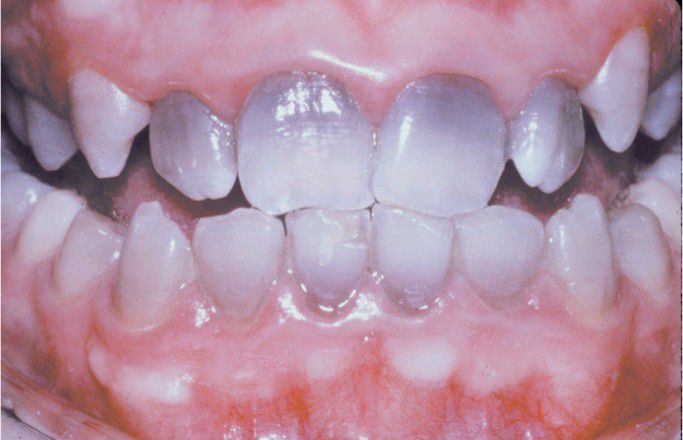 Diffuse grayish-blue discoloration of the dentition. Cervical portions are stained most intensely