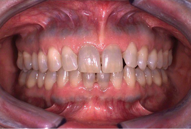 Dentition demonstrating grayish discoloration predominantly noted on the incisal half of the teeth. Note the horizontal bands of bluish alteration of the maxillary and mandibular alveolar ridges.