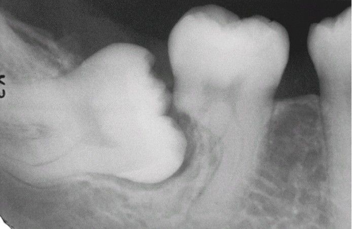 Mesioangular impaction of the right mandibular third molar associated with significant resorption of the distal root of the second molar.