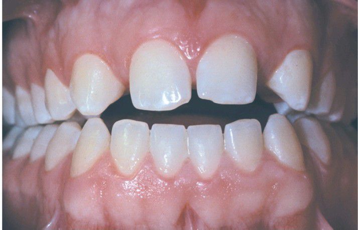 Developmentally missing maxillary lateral incisors. Radiographs revealed no underlying teeth, and there was no history of trauma or extraction.