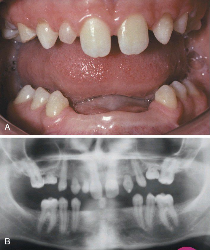 Multiple developmentally missing permanent teeth and several retained deciduous teeth in a female adult. B, The panoramic radiograph shows no unerupted teeth in either jaw