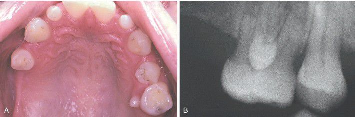 Rudimentary tooth situated palatal to a maxillary molar in a patient who also exhibits hypodontia. B, Radiograph of the same patient showing a fully formed tooth overlying the crown of the adjacent molar.