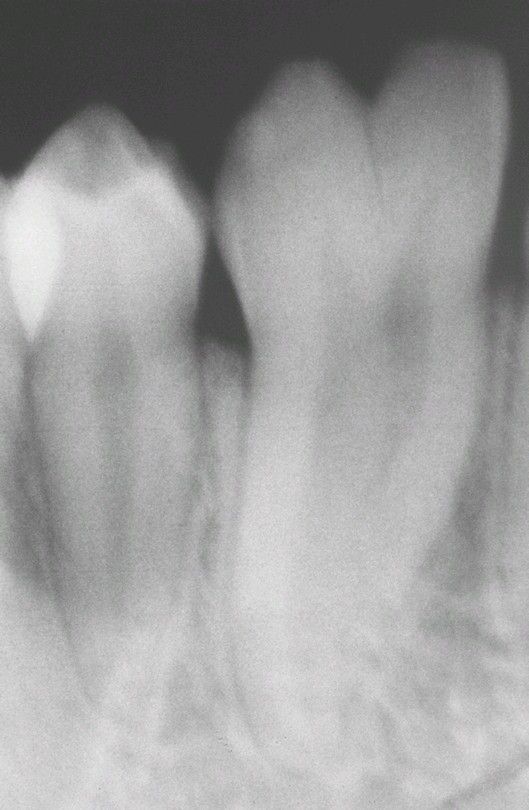 Radiograph of the same patient depicted. Note the bifid crown overlying the single root canal; the contralateral radiograph revealed a similar pattern.