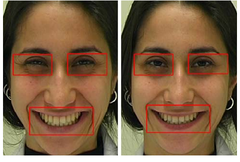 Genuine smile on left and posed smile on right By definition the posed smile is voluntary and not elicited by an emotion. It can be a learned greeting or a signal of appeasement and can be sustained. The posed smile is reliably repeatable.