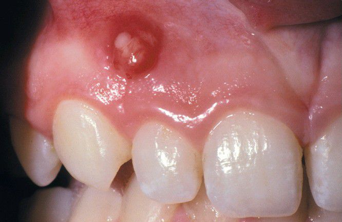 Parulis overlying vital maxillary cuspid and lateral incisor. The cuspid contained a dens invaginatus that perforated the mesial surface of its root.